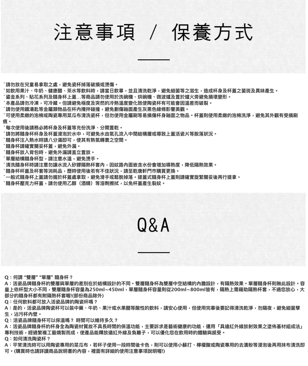 活瓷品牌元素陶瓷塗層具釋放遠紅外線功能 不挑飲品,咖啡、茶類、中藥、果汁、果醋及牛奶等皆可裝 經內部實測具保溫、保冷效果,四季適用 SUS304雙層不銹鋼外殼、杯蓋食品級矽膠墊圈 方便清洗,不易細菌滋生 商品皆附精美紙盒、提袋 是您送禮首選