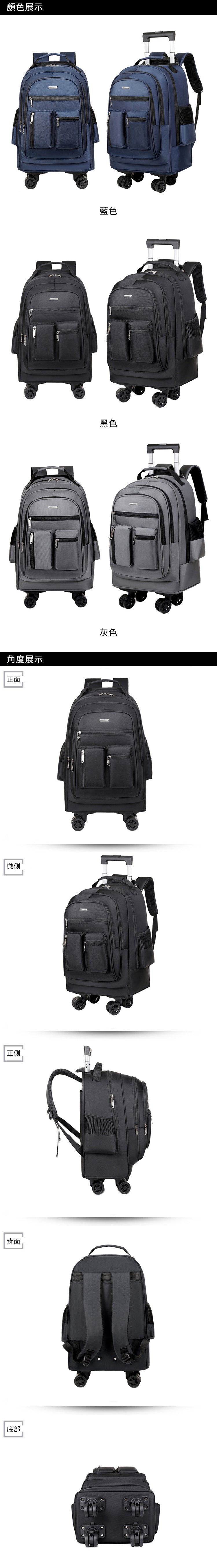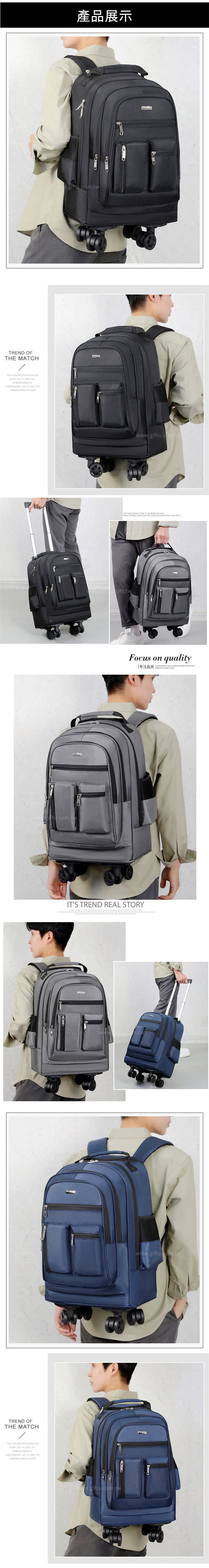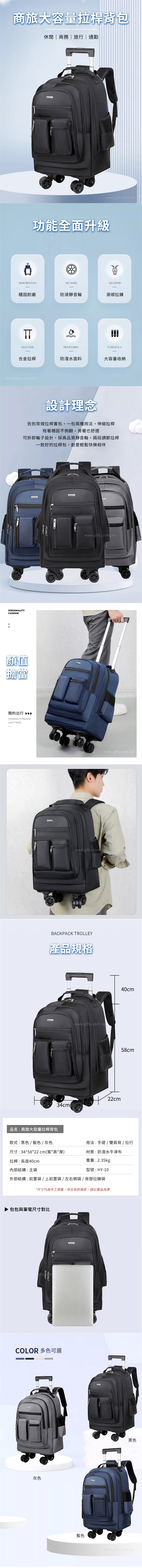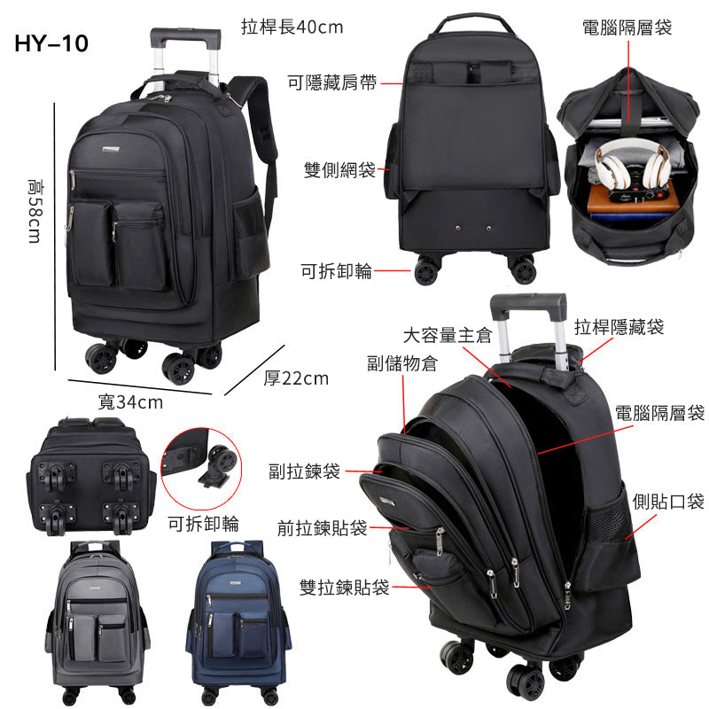 型號:HY-10 重量:2.35kg 材質:防潑水牛津布 尺寸:34*58*22(寬*高*厚) 拉桿長度:40cm 用法:手提/雙肩背/拉行 產地: 中國