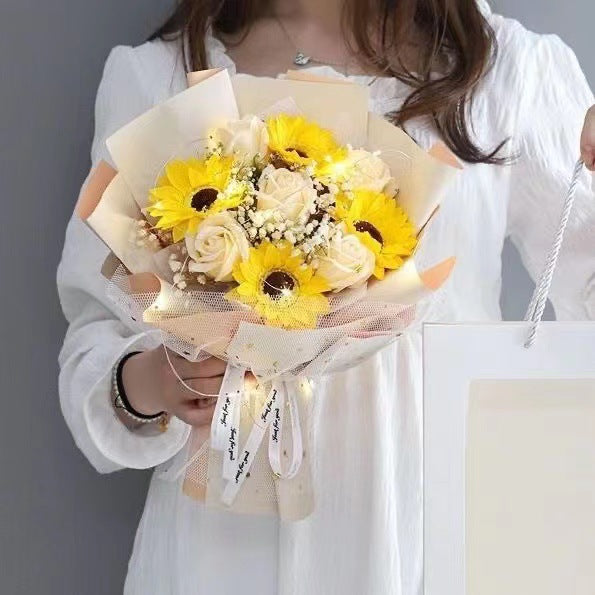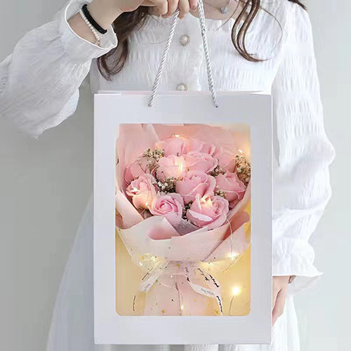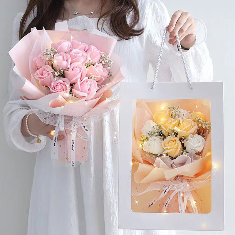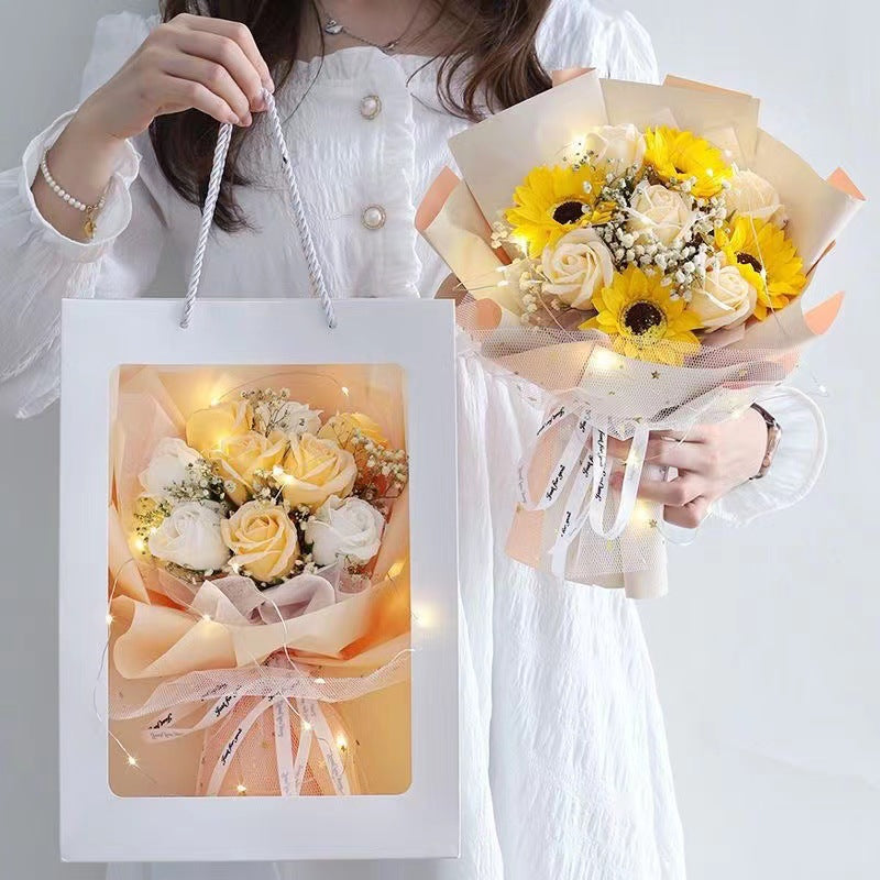 滿天星:乾燥花 向日葵/玫瑰:仿真香皂花 花束尺寸:25*30cm 提袋尺寸:35*25*15cm 產品保固:半年 產地:中國