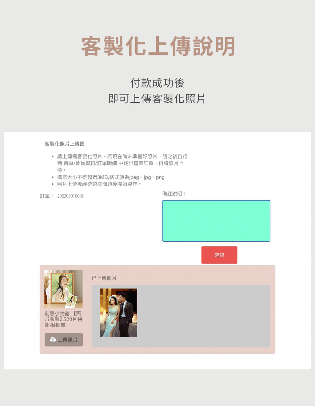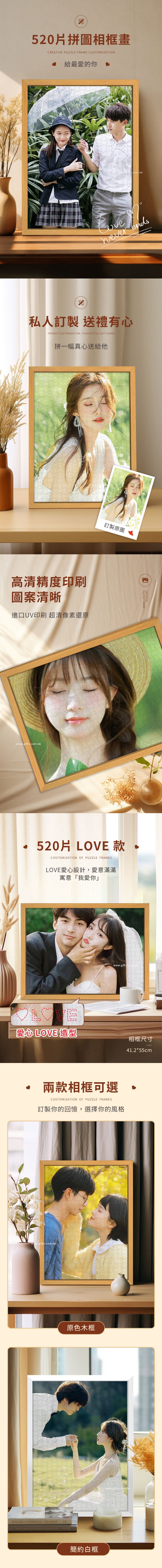 520片拼圖拼出美好想像 畫裡間藏著【♥LOVE】五片造型拼圖 偷偷對你傾訴我的心意 ✅照片請提供「長方形」的尺寸 ✅照片直式橫式皆可 ⚠️客製化商品需先付款完成才可上傳照片 ⚠️請上傳高清原始照片圖檔 ⚠️定制會把圖片放大,圖片太小做出來的效果糊