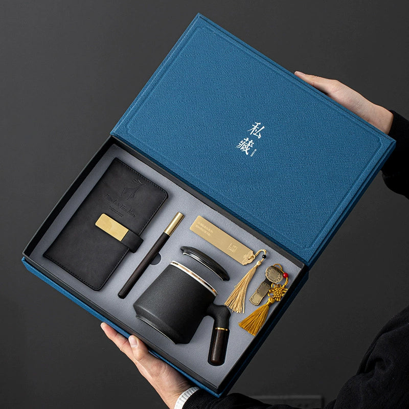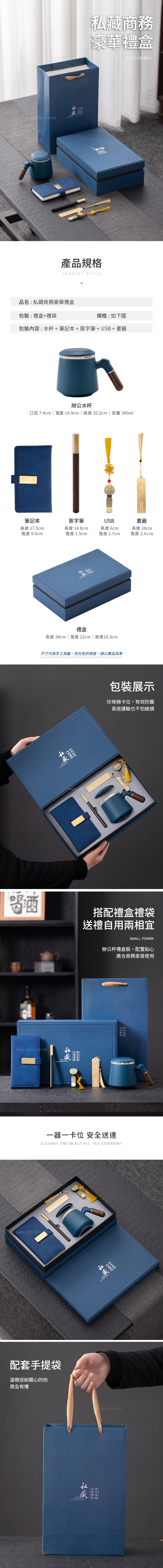 水杯尺寸:7.4*14.9*10.2cm 水杯容量:345ml 筆記本尺寸:9.5*17.5cm 簽字筆尺寸:14.8*1.2cm USB尺寸:6*2.7cm 書籤尺寸:10*2.4cm 禮盒尺寸:34*22*10.3cm 產地:中國