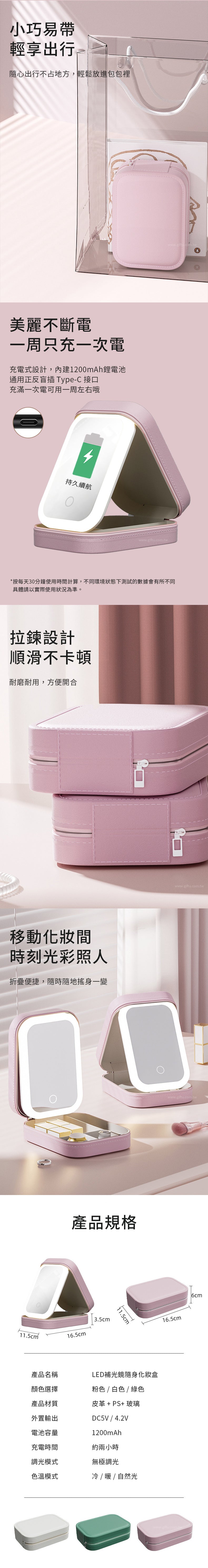 材質:PU皮+PS+玻璃 電池容量:1200mAh 充電時間:約2小時 色溫:冷 / 暖 / 自然光 產品尺寸:165*115*60mm 產品保固:半年 產地:中國
