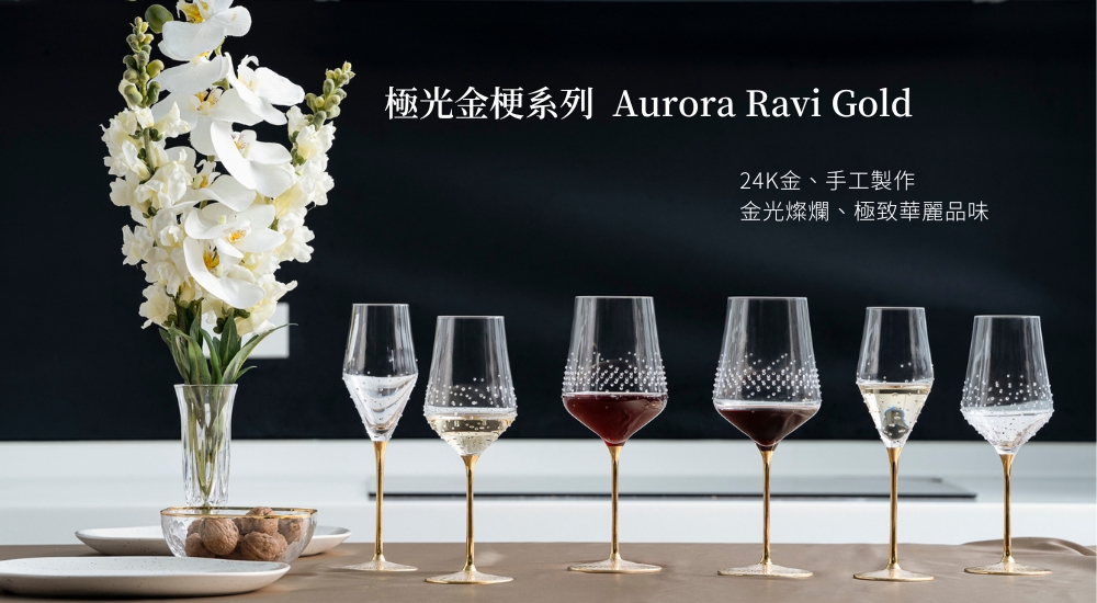 Grandi 推出極光金梗系列,這是一個專為突出葡萄酒的複雜性和感官特徵而設計的極光系列,採用24K純金,德國手工打造,金色杯梗亮麗迷人,搭配水鑽顯得更加閃耀,增添餐桌色彩,成為餐桌上最大亮點。