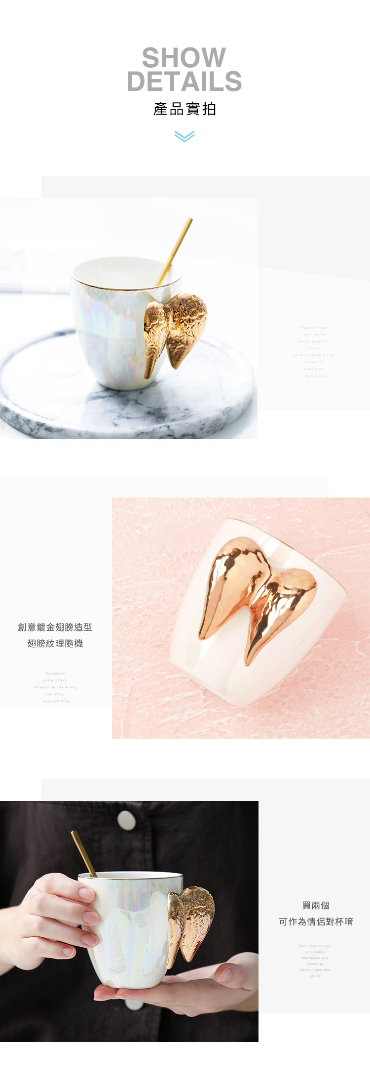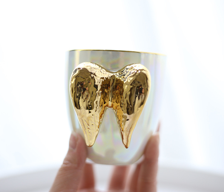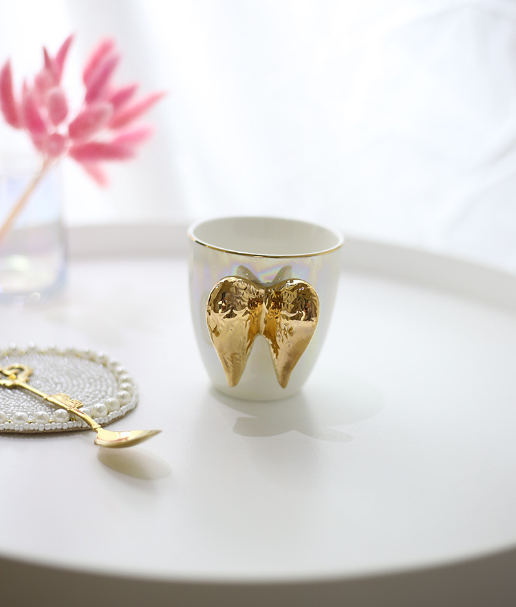 創意鍍金天使翅膀造型、杯身的粉嫩珍珠釉,輕巧精緻,張開雙翼,將溫暖守候化做一杯熱茶的關心!