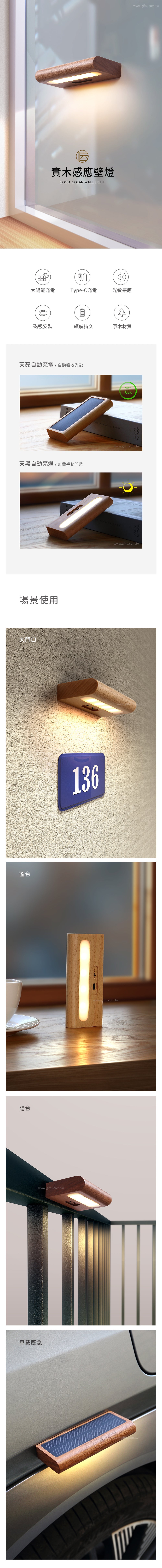 *天亮自動充電,自動吸收光能 *天黑自動亮燈,無需手動開燈 *可太陽能充電,也可電源充電 *兩者疊加,續航更久 *磁吸安裝,免佈線