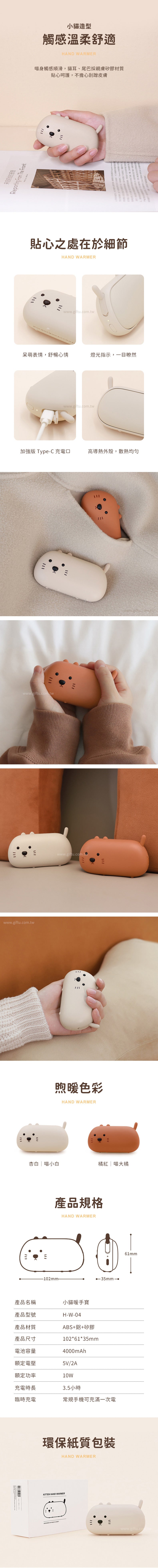 【三秒速熱如貓擁入懷中,解凍冬天冰冷的雙手】 *導熱性能更佳的發熱元件,三秒速熱 *恰到好處的溫暖,高低溫檔隨心選 *NTC精準控溫,防止過熱 *不僅能用於冬天取暖也能為手機臨時充電