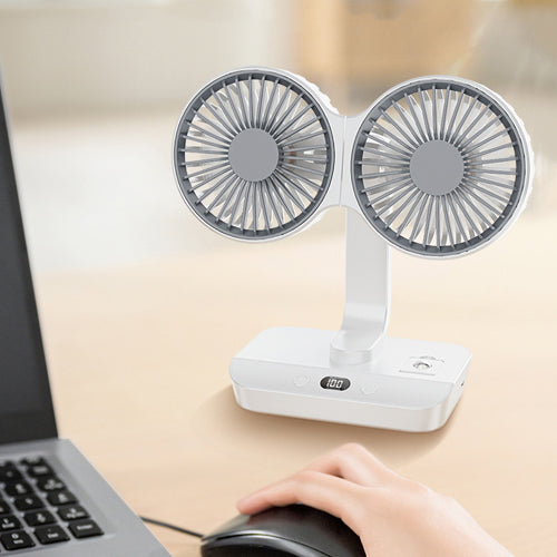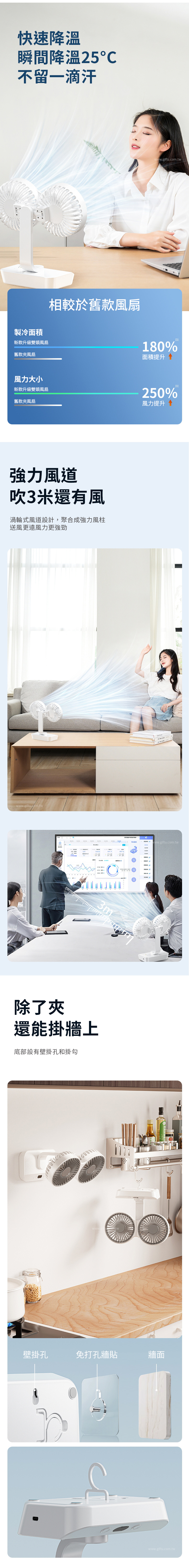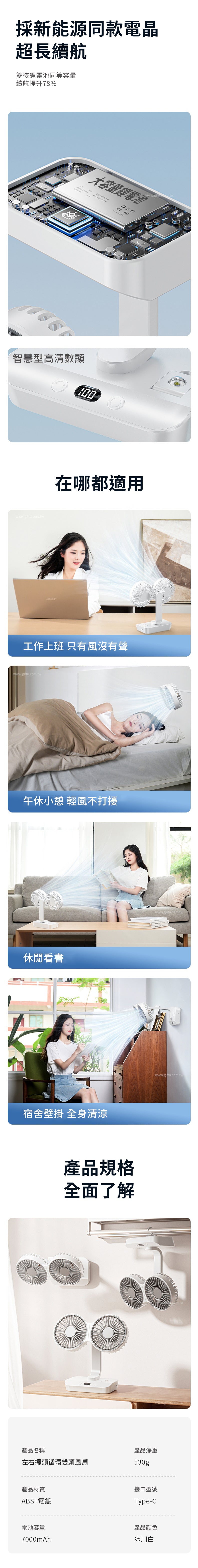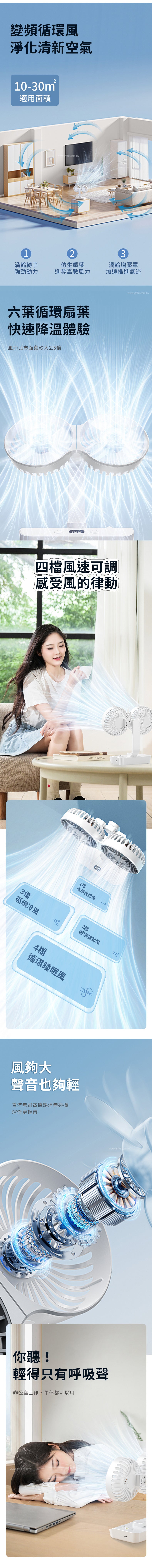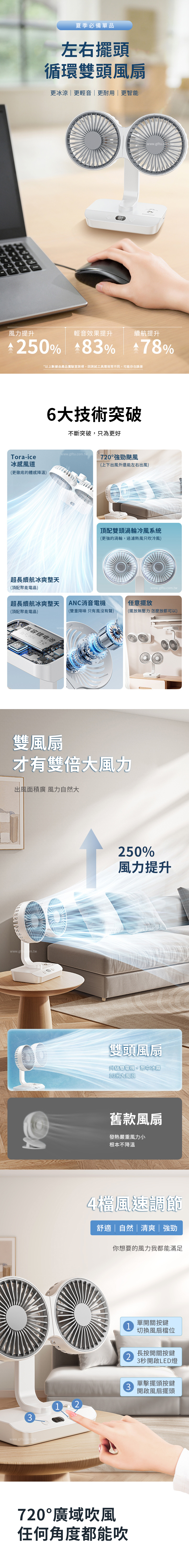 【雙風扇才有雙倍大風力,只有風沒有聲】 *雙風扇,250%風力提升 *4檔風速調節:舒適|自然|清爽|強勁 *720°廣域吹風,任何角度都能吹 *六葉循環扇葉,快速降溫體驗 *直流無刷電機懸浮無碰撞,運作更輕音