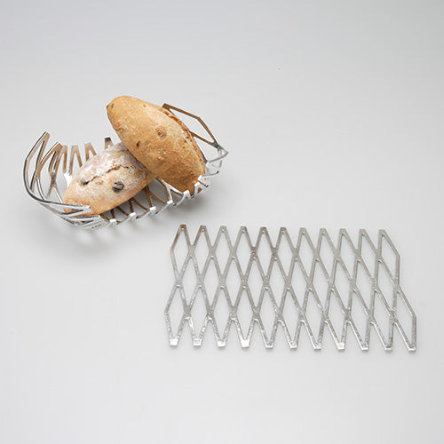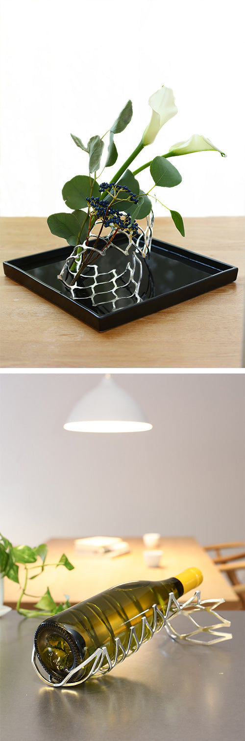 以富山縣高岡市的傳統「鑄物」產業的加工技術下培育出的鑄造技術為基礎,使用本錫製作而成。本製品將錫柔軟的特色發揮到最極致,經過拉扯灣曲後就能變成置物籃。可當紅酒架、水果籃、點心盤或是插花時當作裝飾品使用。 錫導熱快,建議冷飲避免燙傷。 請勿使用於酸性飲料以避免產生腐蝕。 使用後請用軟布或海綿搭配廚房用中性清潔劑洗淨。 為避免在表面留下刮痕,請勿使用鬃刷或含有顆粒的清潔劑。 光澤感消失時擦拭市售的金屬亮光劑或齒粉、小蘇打等物品就能恢復光澤。 低熔點,請勿放置於火源附近。 請勿使用於微波爐。 請勿放入冷凍庫,以免錫杯變色或變形。 請勿使用於洗碗機或烘碗機。 本商品無開放試用,因為無法再賣給下一個消費者,請支持好設計。