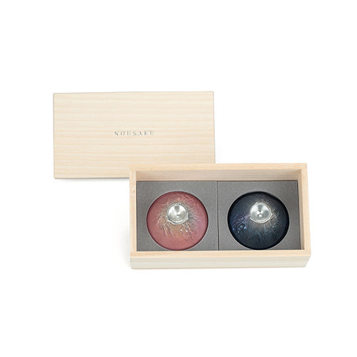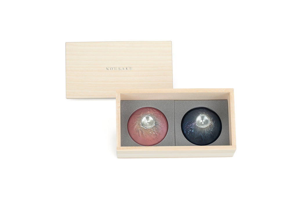 櫻色・藍色富士山風情杯是以世界文化遺產、日本第一高峰之「富士山」為造型設計。櫻色富士山風情杯在杯身施以櫻花色漸層與青藍色漸層,山頂則保留錫的原貌,表現出富士山頂白雪皚皚的景象。 而內側貼有金箔的富士山清酒杯,選用日本市占率99%的金澤金箔,每一個富士山風情杯都是能作職人手工製造,服貼契合掌心,令人感受手作溫暖。杯底的富士山造型,讓您飲酒時還能欣賞富士山的雄壯之美。 自古以來純錫有「放入錫器的水不易腐壞」,或是「純錫去除酒的雜味,讓酒變得更好喝」等說法,因此純錫常用來製作清酒器或茶具。富士山的吉祥寓意以及採用木盒收藏包裝的對杯禮盒,適合作為喬遷禮物、新婚賀禮、結婚週年紀念、商務贈禮,為您的心意錦上添花。