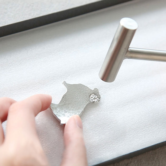 *注意:所有商品皆為手工鑄造製作,每個商品外觀都會有些微差異。此外,鑄造時產生的氣孔、流痕皆不屬於瑕疵範圍。 能作DIY鎚目組合讓您在家就能體驗手工鍛造樂趣。「槌目」是指鐵槌敲打出的花紋,毛茸茸筷架鎚目組藉由鎚目紋理表現綿羊、貴賓狗蓬鬆的絨毛,讓您親手打造出專屬於自己的可愛筷架。 【如何敲出鎚目花紋】 1.請用翻開的商品盒蓋墊底,並用附贈的白色襯墊鋪在盒蓋底部。 2.將筷架放在白色襯墊上,用手指壓住固定。接著使用圓弧的鎚頭從筷架邊緣往中心敲擊。 注意:請小心不要敲到自己的手指。 3.正面敲擊完畢後,請翻到背面,同樣從筷架邊緣往中心敲擊。 注意:有節奏且不留空隙地在整個筷架表面敲擊,就能創造出漂亮的鎚目花紋。 【敲擊時請注意】 ・使用鐵槌敲擊筷架時,可能會不小心敲到筷架周圍的桌面,所以開始作業前請務必要在桌面舖上內附的白色襯墊。 ・請使用鎚頭的圓弧面敲打筷架。 ・使用鐵鎚敲擊後,筷架的顏色可能會出現變化。請放心,這並不影響商品的品質。