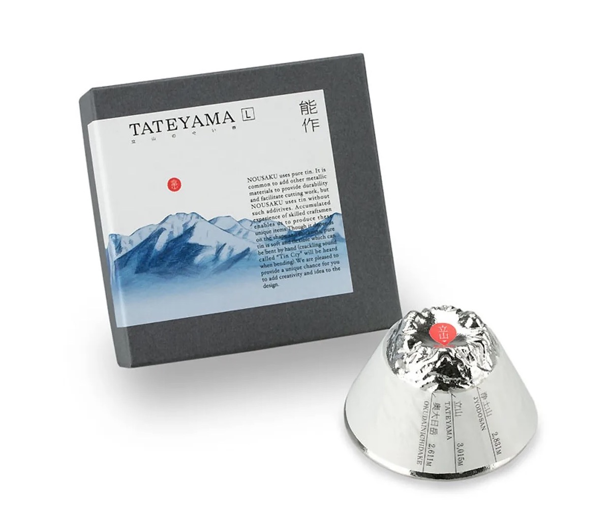 以富山縣引以為傲的日本三座名山之一的立山山脈做為造型的純錫清酒杯。在清酒杯上呈現立山山脈的全貌。 請您用立山造型杯暢享口感溫潤、味道純粹的美酒。備有L、S兩種尺寸,可依照您的喜好選擇。(沒有販售兩個尺寸一組的套組) 為了清楚分辨每座山的位置,在酒杯外緣附上薄紙做標示,也很推薦做為贈禮。