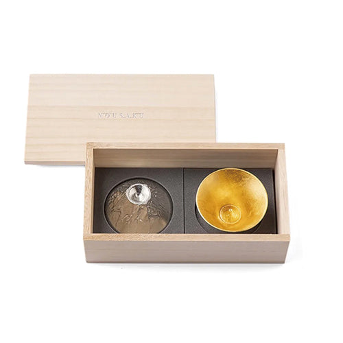 ・商品尺寸:φ73 x H35 (mm) ・木盒尺寸:H65 x W207 x D112 (mm) ・重量:97g(單個) ・材質:錫(100%)、金箔 ・產地:日本富山縣 ・製造方式:手工鑄造