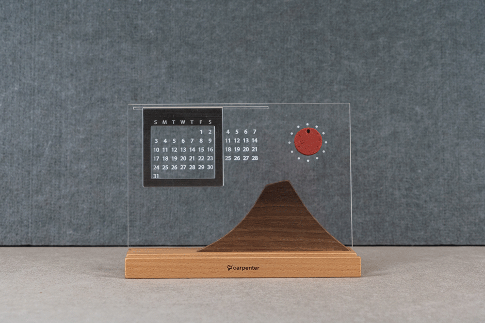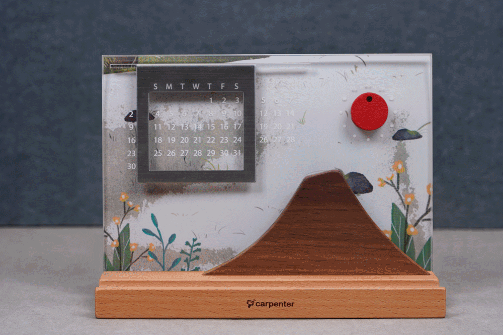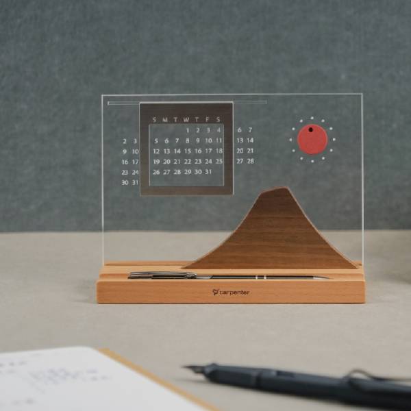 完美的一日, 有,窗外的風和日麗, 與,桌上的風和日曆。 煦煦日光繞著圓轉動,象徵12個月份;金屬銘版可隨心移動,象徵每周的日期。 山峰的景色讓人嚮往出遊時的風和日麗,底座可收納桌上文具以及名片、Memo。 讓風和日曆成為你桌上的一片風景,陪伴你每一日。