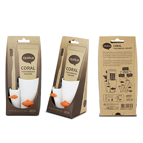 還小丑魚一個家 你知道嗎?氣候變化影響著地球上所有生物,甚至是我們海洋中美麗的珊瑚礁。 當全球氣溫逐漸升高,暖化效應將使珊瑚白化,依靠珊瑚礁而生存的小丑魚就會沒有了家,請好好愛護這個大環境,還他們一個家。 牙刷架有三格,可分類收納你的盥洗用具。 備註: 使用6個420ml的回收寶特瓶所製成,100%可回收。