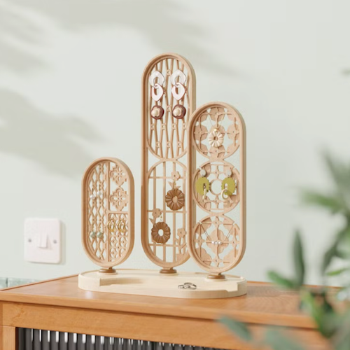 獨木設計UniWoodesign,優木良品認證產品,花窗記憶 - 飾品收納展示架。 將台灣鐵窗花特色,透過木材的切割、雕刻,展現簍空的效果,並賦予其功能性,可固定各種飾品,在設計上也展現了台灣鐵花窗的多種面貌,成為桌上一隅的美好風景。