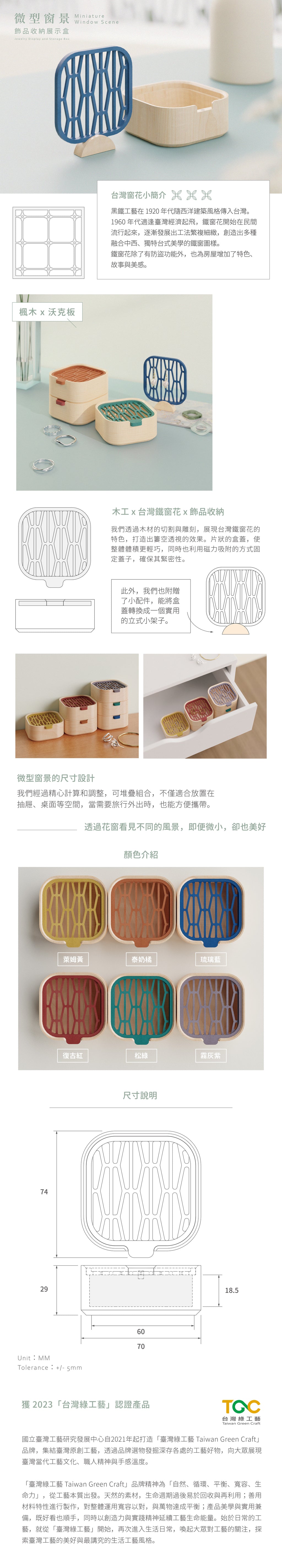 獨木設計UniWoodesign,台灣綠工藝認證產品,微型窗景 - 飾品收納盒。我們透過木材的切割與雕刻,展現台灣鐵窗花的特色,打造出簍空透視的效果,並製成片狀的盒蓋,使整體體積更輕巧,透過花窗看見不同的風景,即便微小,卻也美好。
