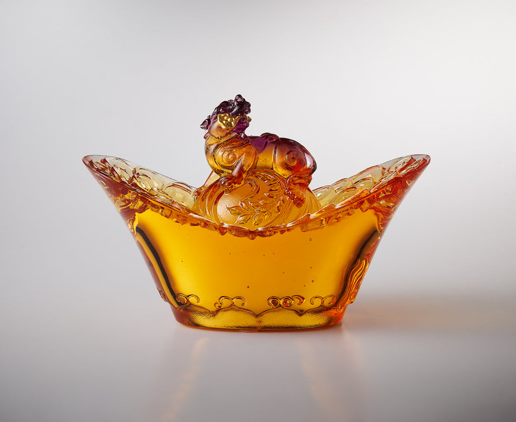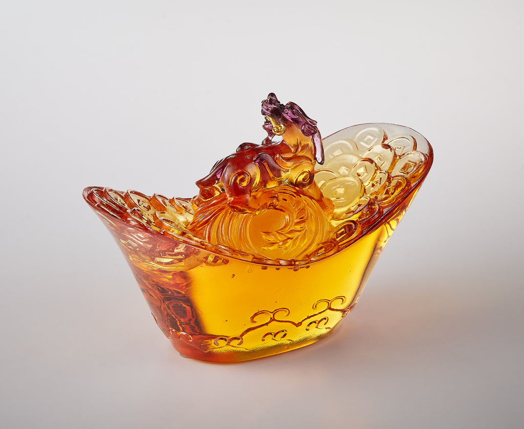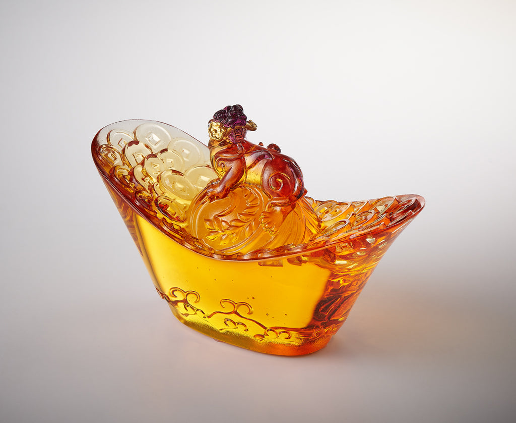 登臺展姿 風采自現傾眾目 財庫湧動 機遇緊銜轉瞬間  左右亨通 天下名傳  此刻 時來運轉 一生 有錢有閒 Wishing for Wealth: Pixiu on a Yuanbao Standing on the "Yuanbao," an ancient form of Chinese currency, is the Pixiu, one of the most beloved mythical creatures in Chinese folklore. Renowned for attracting wealth, the Pixiu is depicted in a dynamic pose, biting onto a "Ruyi," a symbol of good fortune. This imagery suggests that it has seized the perfect opportunity, ensuring a continuous flow of abundant wealth. · 為2025年新春祝福而創作的作品,因此設計師結合了漢文化在民間最廣為流傳的六大好寓意元素,包含元寶、銅錢、稻穗、雲紋、貔貅、如意,有著讓我們最喜愛的發財好祝福,也融入文人雅致的古物氣質。 · 美感與工藝 - 集結六大吉祥元素,以單色琥珀作品保有工藝的典雅感。 - 元寶造型參考早期的「銀錠」,更雅致,也象徵「贏定」 。 在大唐帝國開始出現「元寶」一詞之前,這種以「馬蹄」為造型的「馬蹄銀」(如圖)也稱為「銀錠」。為取其好寓意,設計特別參考銀錠的輪廓。 - 為了讓銀錠外圍能拋光,更顯尊貴,作品下緣的雲紋特別做成陰雕。 - 「回頭貔貅」有更多好寓意,咬住如意也代表能靈敏地咬住好機會。 雖然沒有統一的說法,但民間對於回頭貔貅賦予了很多好寓意,包含有「貔貅回頭,吃穿不愁」、「左回頭升官,右回頭發財」、「貔貅左回頭,黃金萬兩蓋過頭;貔貅右回頭,風生水起鬼見愁」等俚語。(由於對於左右回頭的分法找不到特定的說明,所以作品較難定義是屬於哪一種,可依需求解釋) - 貔貅踩著圓珠,也有轉運的期許。