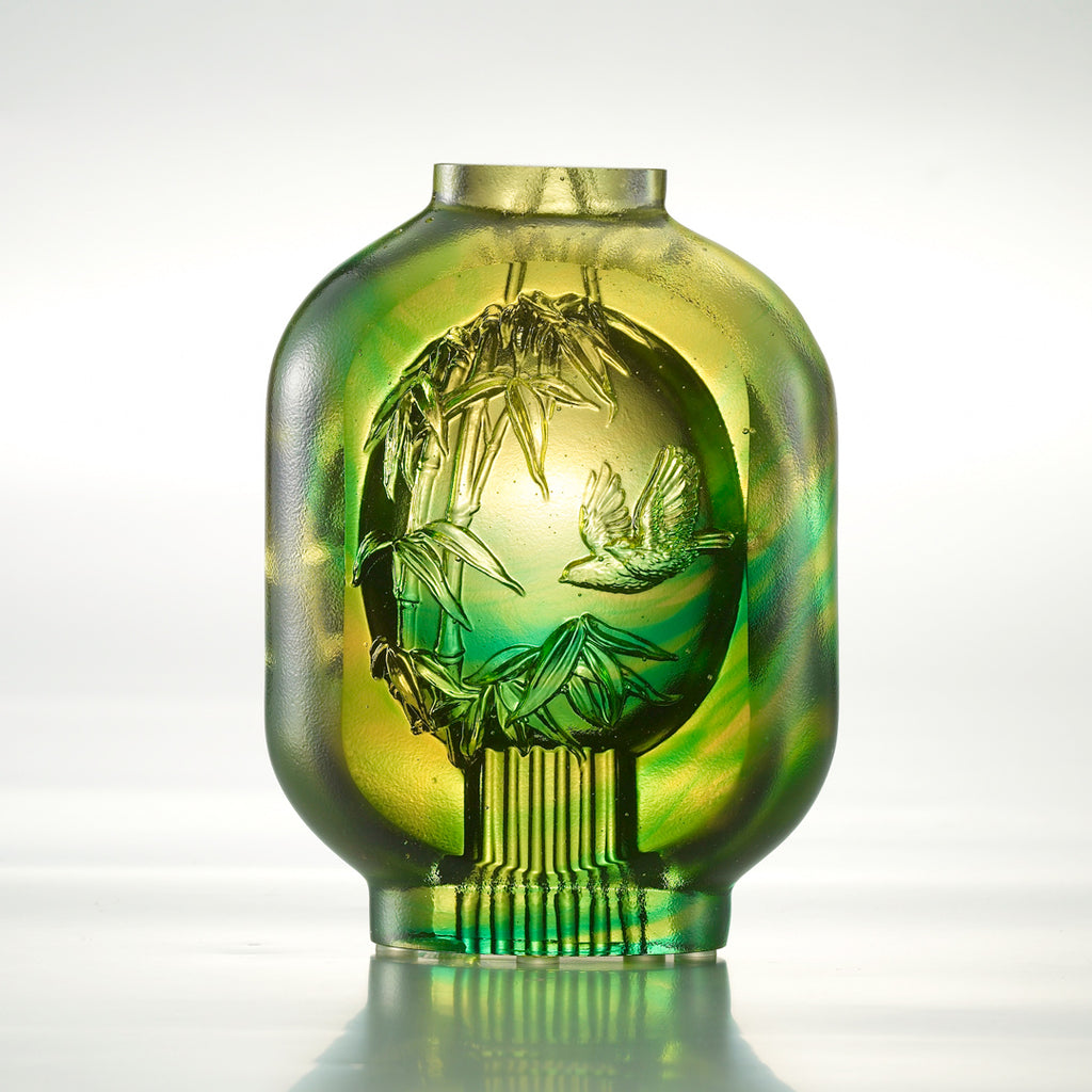 虛心 能容四海 有節 不卑不亢 一路高昇 點亮功成名就的階梯 創作理念: 1. 因本件為歲末推出之節慶小品,所以設計師將隨身攜帶的鼻煙壺轉化為桌上擺飾的創作小品。外形則以燈籠為概念,鼻煙壺之外形與花紋則變成內部之紋飾。 2. 作品造型以燈籠為主,既符合歲末張燈結綵的喜慶意味,也有在新的一年點亮前程,帶來光明的意涵。作品的外形為圓形,也具有祝賀對方圓滿如意的寓意。 3. 竹子象徵「虛心有節」,引申為每個人都要能謙虛自持,堅持自我,也象徵警惕自己要能高風亮節,清廉自守;而節節生長的竹子也具有步步高升,邁向成功之祝賀寓意。 4. 竹子旁的鳥為喜鵲,引申只要能堅持自我,謙虛容物,在職場或社會上拓展出屬於自我的風格,喜事也自然會來報到。 本件作品為與故宮合作之創作,原始發想為「清雍正玻璃胎琺瑯彩竹節式鼻煙壺」。(故琺000931N000000000) 建議 : 可搭配購買琉園長方形底座, 讓作品擺放質感更為提升!