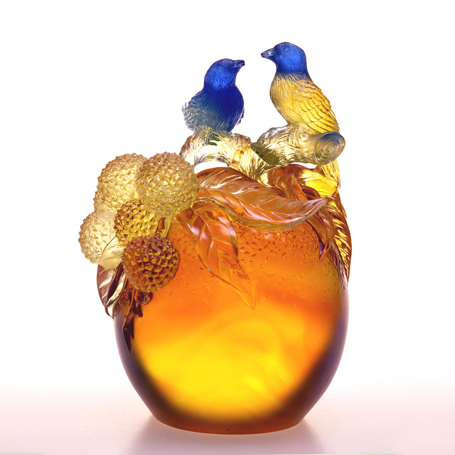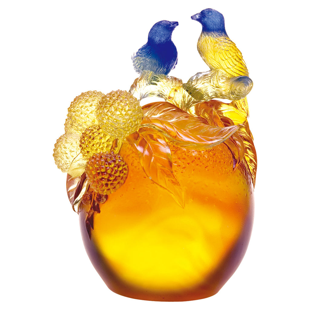 圓熟的香甜內涵 圓實的親切質感 圓潤的舒暢心胸 以耐心關懷灌溉 以惜福感恩滋養 春耕夏耘 豐收結果 學習圓的簡單形式 而因緣圓轉連連高陞 「桔」「荔枝」「李子」三種吉祥果,架構起「大吉大利」的意涵。 「喜報三元」喜—喜鵲,「橘」、「荔枝」、「李子」都是圓形的,即寓意三元。 「元」隱喻為古代科舉成績優秀考試有「解元」「會元」「狀元」的意思。 藉由「圓熟」---自我內涵實力,「圓實」---做事腳踏實地,「圓潤」---相處圓融和諧,因此而圓滿高陞 以「桔」、「荔」、「李」圓的造型,進一步闡述「圓」的概念;以果實的豐潤香甜,引喻生命的美麗特質;以果實的豐收,表達春耕夏耘的因果關係,是一切圓的形式;而學習「圓」的簡單形式,即有因緣圓轉,連連高陞的圓滿結果。 建議 : 可搭配購買琉園正方形底座, 讓作品擺放質感更為提升!