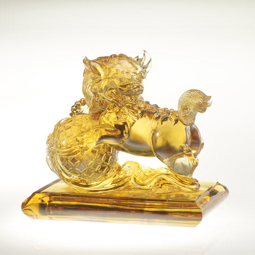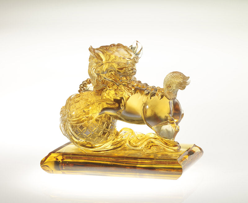 轉動信心 轉動好景 無論大事小事 好事就在後頭 典故 獅子是中華文化中的吉祥瑞獸,但中國沒有獅子,獅子文化是漢朝時從中亞、印度傳入中國,唐朝後開始普及。 中華文化中,獅子是勇敢、威武的象徵,所以可以避邪、鎮煞。之後又逐漸有了富庶、平安的象徵。 逢年過節時中華文化會舞獅,象徵能去除惡運、帶來好運,並祝福每個人在新年都能運勢興旺、事事如意。 傳統的石獅分為兩大類,象徵威嚴的北方獅與象徵活潑的南方獅。本系列作品是以南方獅為主。(北方獅的代表作品是【獅震八方】) 設計 設計師以傳統南方石獅的造形為主,設計成可愛的擺飾小品。 傳統工匠在雕刻石獅時,通常會讓獅子玩綵帶、綵球,展現其快樂活潑生動的個性。設計師以傳統獅子舞繡球的造形為主,象徵轉運納福。 獅子回頭的造型象徵「好事在後頭」,也剛好與【時時有利市】可以搭成一對。 設計師採用南方獅的造形,因為南方獅在造形上都較為活潑、靈動,可以展現出蓬勃的生命力。 名稱藉由「獅」、「事」的諧音,並加上綵球的設計,傳達有著正面樂觀的態度,生活與工作自能無往不利、好運連綿。 話術 在家中擺放石獅,可以鎮煞、開運,可以在節慶或過年時作為擺飾。 綵球象徵轉動好運、喜慶不斷,也十分適合放在職場作為開運的擺飾。 獅子大笑的逗趣樣子,不僅逗趣可愛,也象徵好運即將到來。 本件作品與【時時有利市】可以搭成一對,象徵好運、財運滾滾來。 工藝與琉璃之美 獅子身上鬃毛的細緻浮雕與豐富的表情,在拋光時都必須小心碧面拋光過度而破壞造形。 獅腳與綵球的鏤空,在冷卻時容易與底座因應力釋放不均而斷裂。