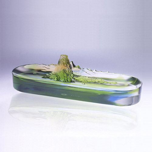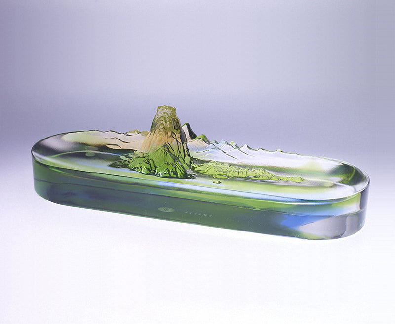 船影劃開青碧 山春水富 俯仰可得 但有會心 自成丘壑 故我問 何必隱於山水 典故 原始文物:元 黃公望〈富春山居圖〉(故畫001016)。本幅畫是元朝畫家黃公望的作品,創作於1347年至1350年,以浙江的富春江為背景,山水的布置疏密有致,墨色濃淡乾濕並用,用墨秀潤淡雅,但氣度不凡、極富變化,是黃公望的代表作,後世讚譽為「山水畫第一神品」。 本件作品在清朝初年曾遭遇火災,燒成前後兩段,前段經過修補後稱為「剩山圖」,約51.4公分,現在藏於浙江省博物館;後段稱為「無用師卷」,約636.9公分,藏於台北的國立故宮博物院,本件作品即是用「無用師卷」中的一段創作而成。 典藏卡內容:以古人觀賞山水畫,想像將景色載回家中為發想,並結合「置物盤」的置物功能,彷彿在盤中裝滿富春江的優美風景與自然之情感,讓我們在生活中也增添許多從容而開闊的心胸。 設計 以古人懸掛山水畫,是想像將景色載回家中的概念為發想,並結合「置物盤」的置物功能,彷彿在盤中裝滿富春江的優美風景與自然之情感,讓我們在生活中也增添許多從容而開闊的心胸。 設計師將江水的部份挖空成為置物的空間,物品放置在容器中,就像是一艘航行在山水之間的小船,讓忙碌的生活多了一個悠閒的感覺。 話術 作品中的浮雕在光線穿透下,會產生深淺不一的折射,展現出一種空間的深度。 本件作品也十分適合作為桌上或窗邊的小盆景。 富春山居圖是故宮博物院最知名的文物,十分適合送給對中華文化有興趣的國外朋友。 工藝與琉璃之美 山的細緻陰雕在拋光時,容易因拋光過度而產生變形;底座也必須能保持其俐落的直線,十分考驗工藝團隊的技術。 整體顏色的流動,必須在置入玻璃料時就先經過精密計算,才能展現出山水畫中墨色流動、濃淡的美感。