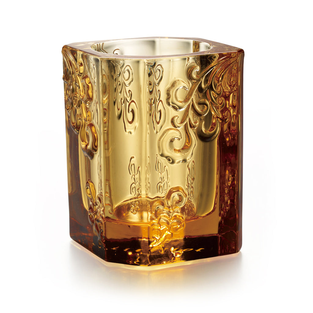 勇於探索的觸角 十步之內必有芳草 而欣欣向榮無限寬廣 卷草紋的設計,有不斷伸展而生生不息的意喻,於是藉卷草不斷延伸的觸角,傳達勇於探索的腳步,必能滋長出生命的芬芳(「十步芳草」喻到處有人才),而走出更開闊的生活風景,一如文字耕耘(筆筒的功能),愈是鍛鍊、愈是勇於探索,就愈能自由發揮。