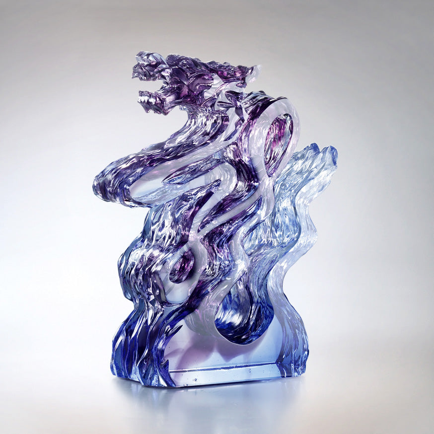 多少風浪鐫刻的瀟灑 把氣聚內 勢如雷動 把心放下 行如電掣 即縱意所如馳萬里 無所不至而耀天下 傳達龍行「電」掣的概念 其以行草書寫的「龍」字,將龍的造型展現出曲折而飛揚的力道,如蘊雷勢而馳電掣,傳達龍行「電」掣的概念。 而這運轉之間的瀟灑飛動,無非是生命之中,經大風大浪(作品線條亦如水紋流動)後才有的灑脫自在,於是就把這經年累月的見識經驗好好收藏於內,待時機成熟便自然能爆發出無限的能量。 一如書法行草之運筆,心靜而氣定,氣定而生源源不絕的能量,而能一氣呵成,完成勢如雷動、行如電掣的縱意瀟灑,展現無所不至、無邊無際的光彩輝耀,而正面拋光處理,更現電光閃耀的光彩。 作品名稱【氣運生輝】 即取「氣韻生動」而加以轉化,既隱然而指行草的氣韻生動,也藉以喻意人的氣勢運道如龍穿梭自如,散發龍行天下的閃耀生輝。 特別是龍尾的飛動設計,更見勁力發動而運行不止的無限能量。