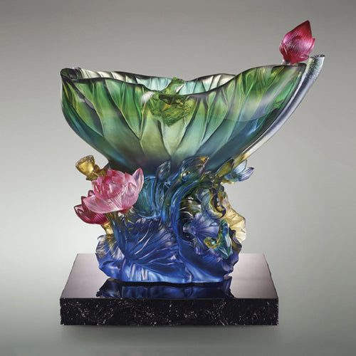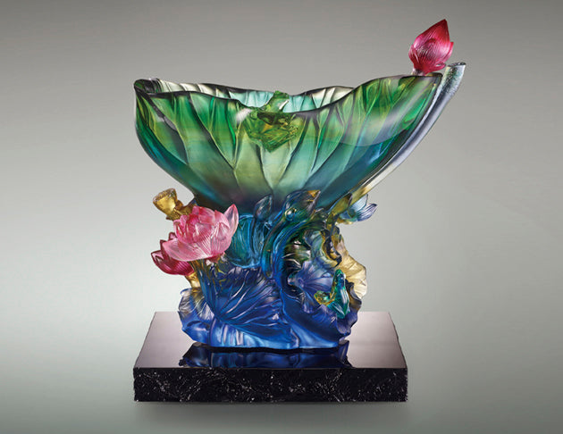 荷爾起常早 晨飲一滴荷葉杯 初照知音 和諧相會 撥紗見曦 同攀同望 探頭 若荷葉是我一畝田 眼前豈是無限 一聲徹明 我志明徹 創意源起: 南宋至明「玉荷葉杯」(故-玉-001859-N000000000)。 「荷葉杯」是造型為荷葉杯狀的筆洗,即洗毛筆的容器;而此件古物材質為玉,所以稱為「玉荷葉杯」。 該件古物以黃綠色玉製作,通體褐黃,部份還顯現灰白斑。造型上,葉梗從底部中心開始彎繞,順勢上揚至杯側。 相較古物看似乾枯的荷葉相比,設計師利用琉璃的高彩與通透,讓荷葉活了過來,並加入古物中沒有的小青蛙,為作品描繪出田園生機盎然、豐收一片的景象。 在造型上,加高了原本的底座,讓荷塘生態更多采多姿,也讓作品在擺飾上更為大器。足夠深廣的容器空間,讓作品可兼花器使用,多了擺飾之外的功能。 設計師更巧妙利用原作品左側的葉梗,轉而在荷葉杯緣妝點一朵即將開苞的荷花,不但成為作品的精彩點睛處,也為整體打造出欣賞的節奏感。 Collaborating with the National Palace Museum, inspired by “Jade Cup in the Shape of a Lotus Leaf, Southern Song to Ming dynasties.” tittot presents the multifunctional ornament depicting the lotus pond. The expansive lotus leaves showcase light penetration and depth through the refractive property of colored glass. Side characters such as lotus flowers and frogs add liveliness to the scenery.
