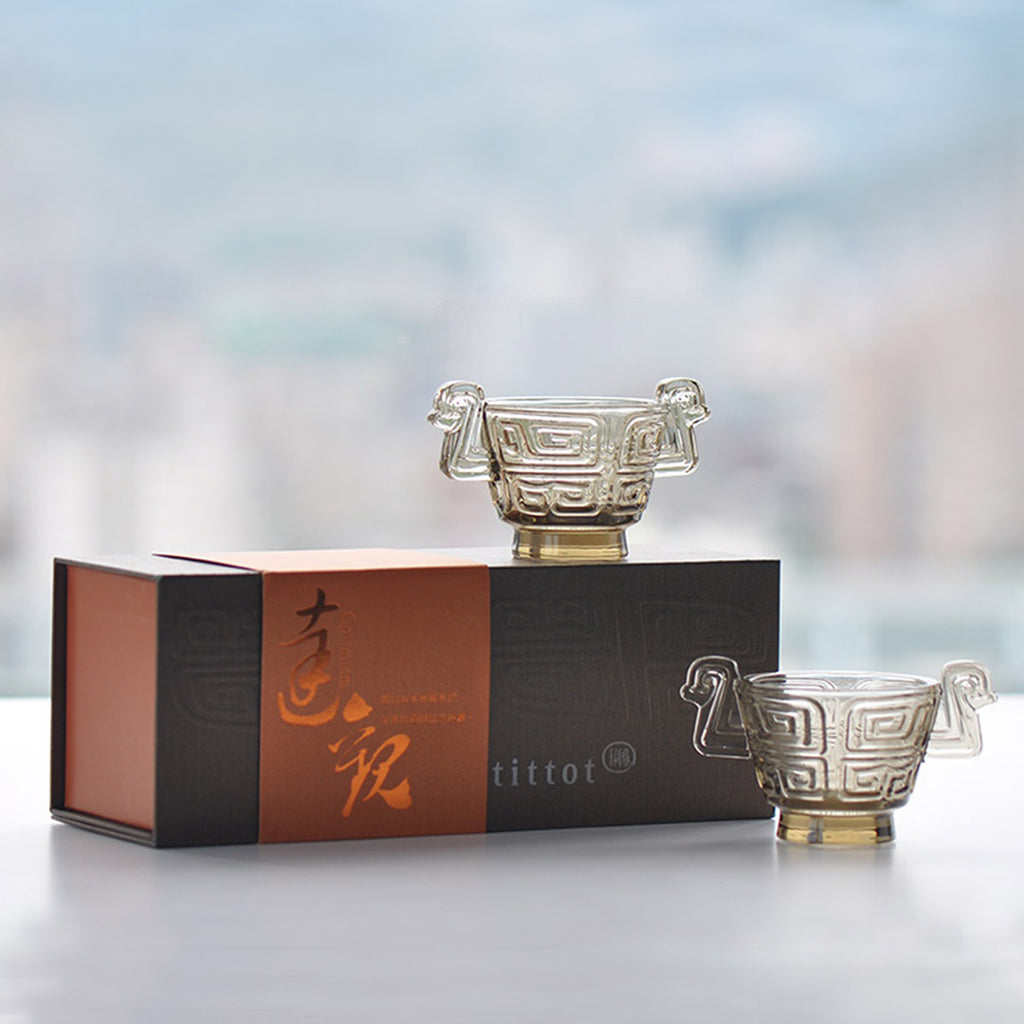 觀山近水無羈無絆, 深邃悠遠的豁然揮灑。 創意來自於西周中期的「銅服方尊」。提耳為象鼻,似贏得榮耀而高舉向前;杯身則飾有獸面紋,如對稱雙眼,看入人心;是故,以前者之騰「達」,後者之眼「觀」,而訂名為【達觀】,此名也與品茶的氛圍呼應--這一杯茶,清新自在,不如暫放俗務,一切了然於心、豁然而開。 文案即藉觀山之高遠(獸面紋之眼)、近水之深邃(水亦如茶),而有豁然開朗的揮灑(象鼻喝水噴灑的意象)。