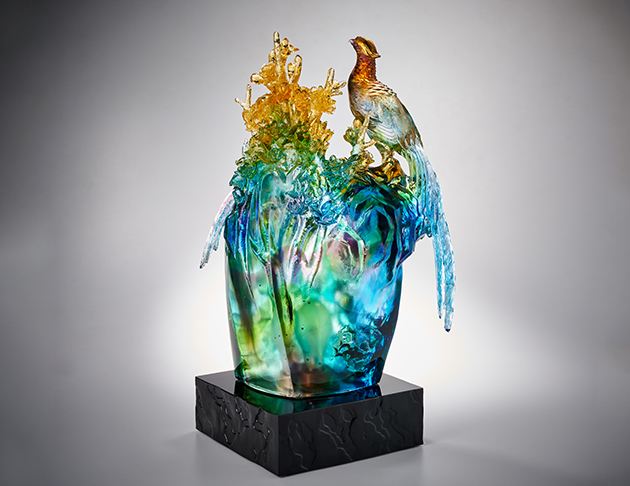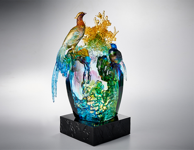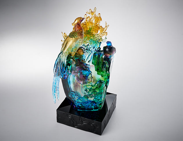春意芳菲戲來客 錦雞交語寄林園 采采華翼 絲絲豔羨 相伴相知相映 不知曙色薄暮 作品介紹| 作品靈感來自國立故宮博物院所典藏的經典畫作〈清 郎世寧 畫錦春圖〉。古畫精隨在於郎世寧巧妙地融合東西方繪畫的手法特色;主角紅腹錦雞,以西方油畫的高彩和寫實光影成為視覺焦點,而環境中的湖石和山坡,卻以東方水墨畫渲染出典雅的調性,兩者相得益彰,融合得恰到好處。 為了致敬畫作的精隨,tittot琉園也借鏡西方立體派思維,將畫作不同局部摺捲成一個立體結構,揉合東西方兩者的特色。此外,透過細膩填料和燈座設計,以琉璃的光線之美,詮釋郎世寧特有的濃厚西式色彩。 作品也承襲古畫為皇上祝壽的目的,期望將畫作上的吉祥、長壽元素,以重新詮釋的琉璃之美,為典藏者獻上最大的祝福。 Exuberant Spring Scenery In collaboration with the National Palace Museum, the work is inspired by the painting ""Beautiful Spring"" by Giuseppe Castiglione, a famous Italian painter of the Qing Dynasty. The greatest artistic value of ""Beautiful Spring"" is the merging of Eastern and Western painting techniques, so our work also borrows from Western cubist thinking by folding different parts of the painting into a three-dimensional structure. In addition, each element of the painting symbolizes auspiciousness and longevity in Chinese culture, and we hope to offer the greatest blessing to the collectors with the beauty of the reinterpreted colored glaze. 工藝賞析 為了讓作品兼具藝術燈具的實用性,tittot琉園在原型雕塑上做了很多巧思,我們將太湖石紋理轉為內側陰雕,使作品外圍能夠拋光到像鏡面一樣。打開燈光時,可以看見層層交織的太湖石陰影,更能感受到強烈的古代園林建築氛圍。 適合典藏主題| 祝壽、婚姻祝福、喬遷、退休