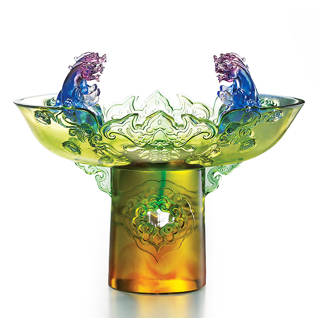 列鼎會中貴 鳴珂朝至尊 作品介紹| 中華文化中,鼎既是食器,也象徵權力與地位;貔貅又名「天祿」、「辟邪」,相傳為龍的九子之一,十分武勇,所以常為眾神巡行天下時的前導部隊,使各方都能夠知道神明即將到來的訊息;相傳貔貅以財寶為食物,而且只進不出,所以又具有招財守財的寓意。 作品重新詮釋鼎的形象,結合貔貅神獸,傳達擁有者的尊貴大器與功成名就的祝福。 工藝賞析| 琉璃的透光與鏤空的巧妙對比,精準的傳達唐代金銀器細膩的層次感;極致的拋光,讓波浪的鏤空更加栩栩如生,但也讓燒結容易斷裂;大量的鏤空,要如何讓顏色精準的填入,是工藝團隊的極大考驗。 Ding and Pixiu Tittot redesign Ding, the ancient Chinese cauldron, by adding the powerful Pixiu to represent the owner’s noble position.