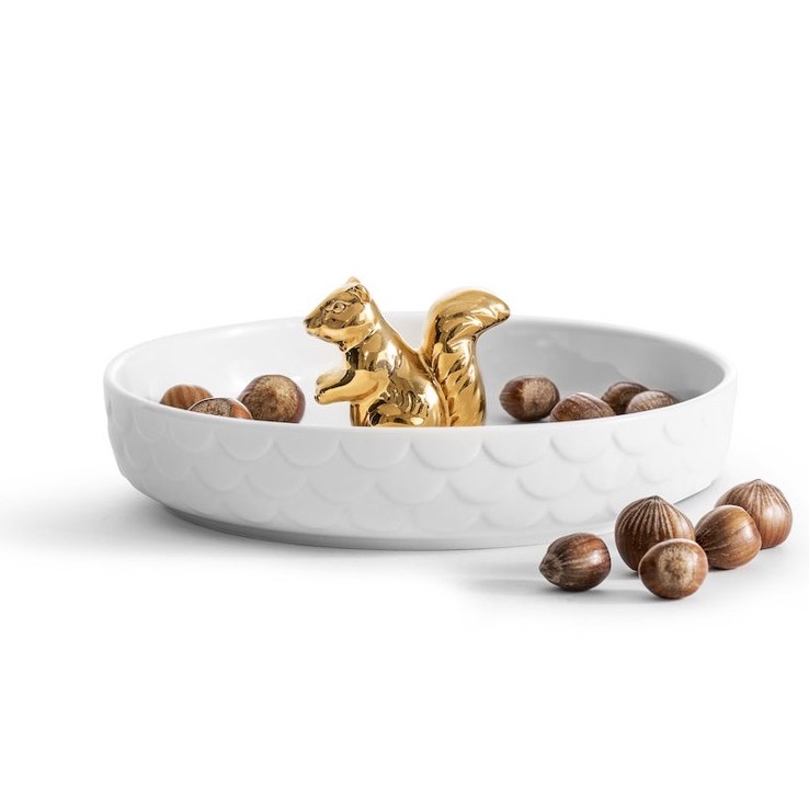 Sagaform 瑞典知名的餐廚傢飾品牌,一系列產品皆與北歐最出色的設計師共同合作完成,結合北歐的自然元素以及流行趨勢,完美地呈現北歐餐桌上的精神以及豐富居家生活品質,不論是送禮或是自用,Sagaform 都是最佳的選擇。 白色優雅的點心盤,盤中央設計了金色松鼠做為點綴,不論是放堅果點心,或是女孩們的手飾飾品都非常適合,絕佳的優雅美感。