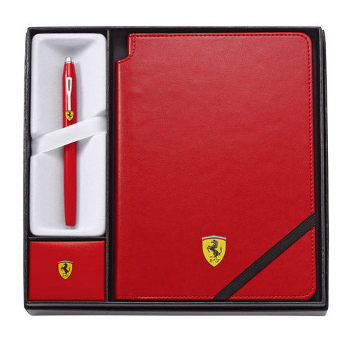 •筆具: 新世紀系列鋼珠筆 •筆記本: 筆記本脊背附有插筆位置, 中號尺寸, 160單行活頁, 高級人造革封面, 頁底儲物內袋 •包裝:法拉利防偽標籤禮品盒、保護禮品盒外套