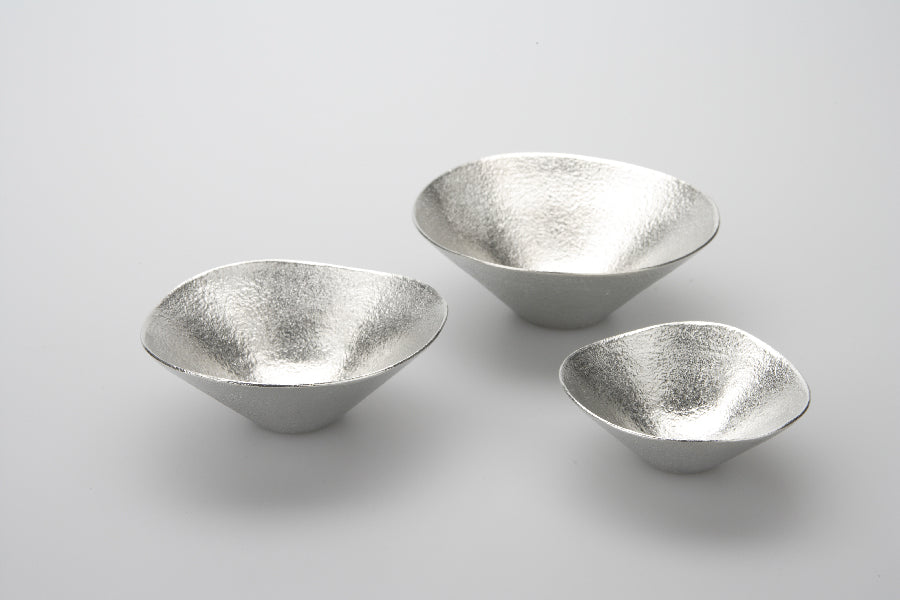 運用富山縣高岡市傳統產業的鑄造技術,使用100%純錫製造的Kuzushi系列,展現出錫金屬特有的溫暖調性及樸拙質感,同時運用錫的柔軟特性塑造出耐人尋味的柔美造型。 100%錫具有抗菌效果,特別適合當作餐具使用。此外錫的熱傳導性高,盛放小菜放入冰箱冷藏1-2分鐘冰鎮,能保持食物的冰涼與鮮度。亦是餽贈親友的最佳選擇。備有L、M、S三款可供選擇。 注意事項 請勿使用於酸性食材以避免產生腐蝕。 使用後請用軟布或海綿搭配廚房用中性清潔劑洗淨。 為避免在表面留下刮痕,請勿使用鬃刷或含有顆粒的清潔劑。 光澤感消失時擦拭市售的金屬亮光劑或齒粉、小蘇打等物品就能恢復光澤。 低熔點,請勿放置於火源附近。 請勿使用於微波爐。 請勿放入冷凍庫,以免變色或變形。 請勿使用於洗碗機或烘碗機。 產地/製造方式 日本/手工鑄造
