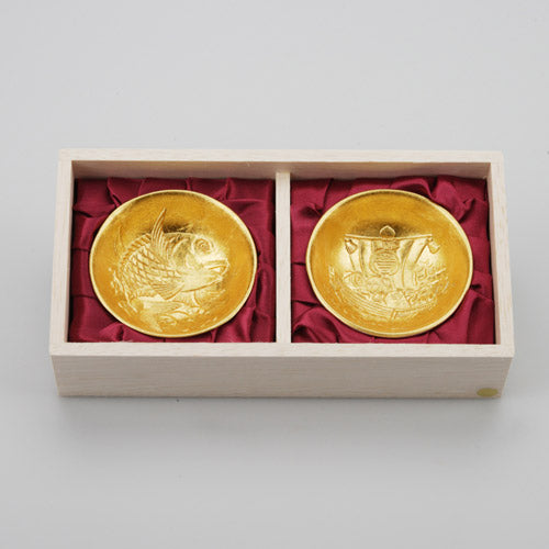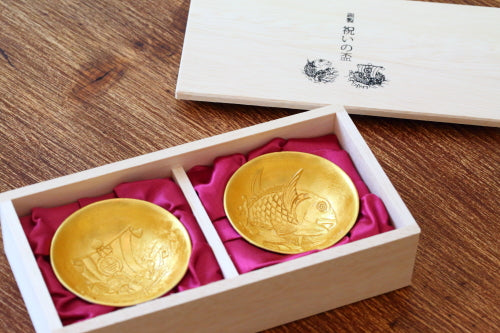 象徵喜慶的鯛魚及寶船圖案的祝賀喜酒杯。運用富山縣高岡市傳統「鑄物」產業所培育出的鑄造技術為基礎,結合金澤的傳統貼金箔工藝所製成的純錫金箔酒杯。錫的熱傳導性高,置入冰箱冷藏1-2分鐘後,就能享受冰涼的酒。或請享受溫酒程度的樂趣。本製品附桐木盒,餽贈答禮都很適合。容量約40cc。 錫導熱快,建議冷飲避免燙傷。 請勿使用於酸性飲料以避免產生腐蝕。 使用後請用軟布或海綿搭配廚房用中性清潔劑洗淨。 為避免在表面留下刮痕,請勿使用鬃刷或含有顆粒的清潔劑。 光澤感消失時擦拭市售的金屬亮光劑或齒粉、小蘇打等物品就能恢復光澤。 低熔點,請勿放置於火源附近。 請勿使用於微波爐。 請勿放入冷凍庫,以免錫杯變色或變形。 請勿使用於洗碗機或烘碗機。 本商品無開放試用,因為無法再賣給下一個消費者,請支持好設計。