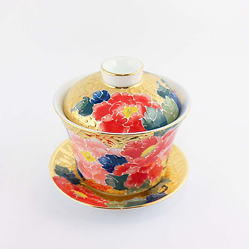 辰鼎窯 花開富貴三件式蓋杯-全鎏金青花