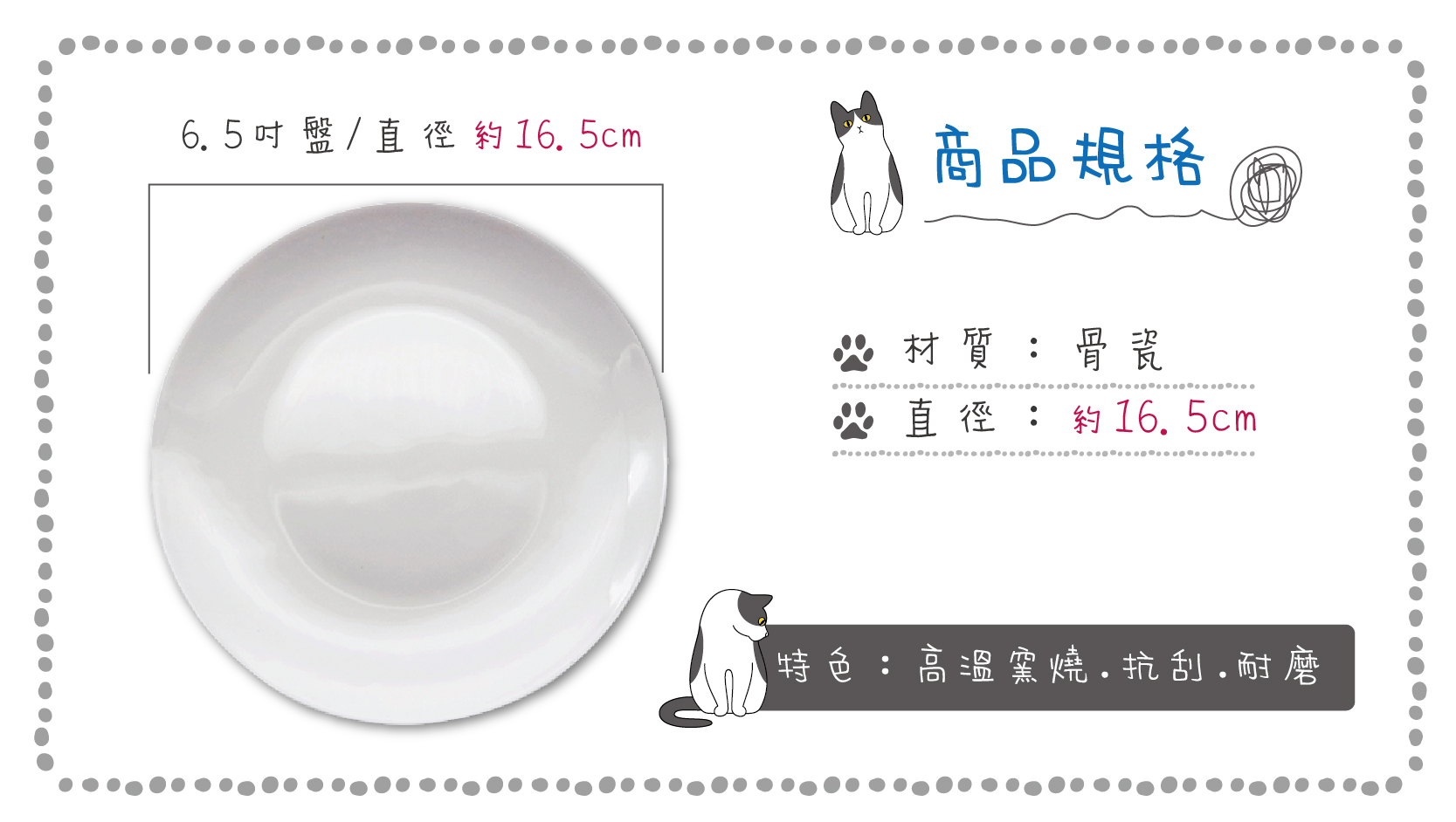 ●產品規格: 6.5吋骨瓷盤,直徑約為16.5cm 。