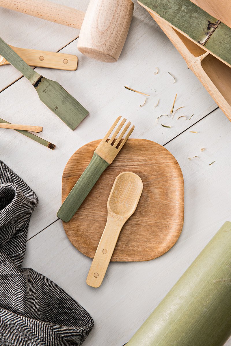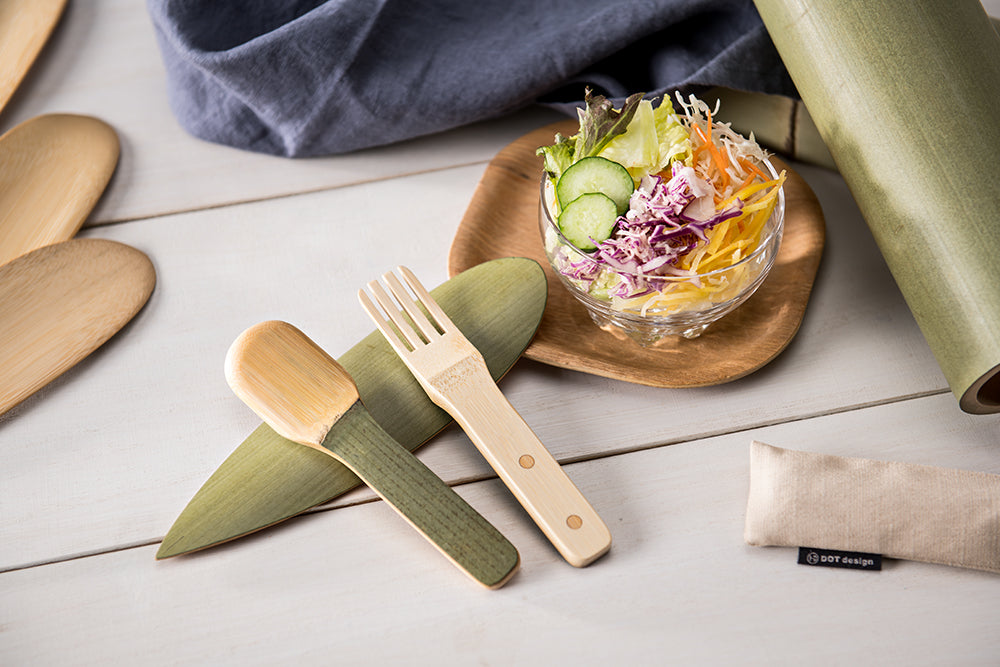 竹材韌性強、重量輕,材質優勢更讓商品添增純樸的自然感,近年來環保意識抬頭發展綠材的應用變成了一種生活態度。 竹叉匙表面運用台灣專利「保青」的技術,保留原始竹皮的青綠。 結構設計上,不拼接竹材,由竹管一體成形出湯匙與叉子,保留原有的紋路與竹節,並配置磁吸功能,方便收納,發揮餐具最大的功能,方便成人與兒童使用。 以往一次性免洗餐具帶來嚴重的生態傷害,期盼減少環境壓力,也落實綠色設計的目的。 2018榮獲台灣OTOP(One Town One Product)產品設計獎。 商品特點 *天然環保竹材質。 *採用竹節突出特性與桌面隔離。 *保留竹皮本身的青綠色。 *二合一(湯匙、叉子)餐具組。
