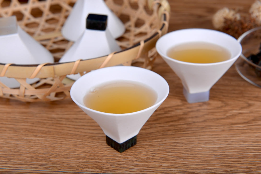 將玉鐲製作過程中所切下的小塊玉石,透過異質拼接手法,打造瓷杯優雅如花的器型。