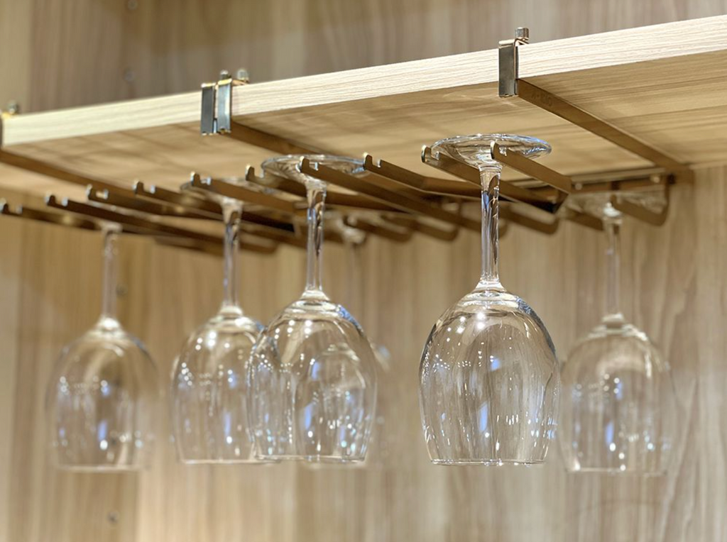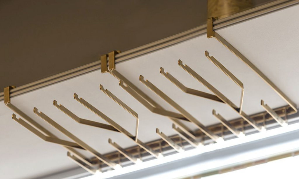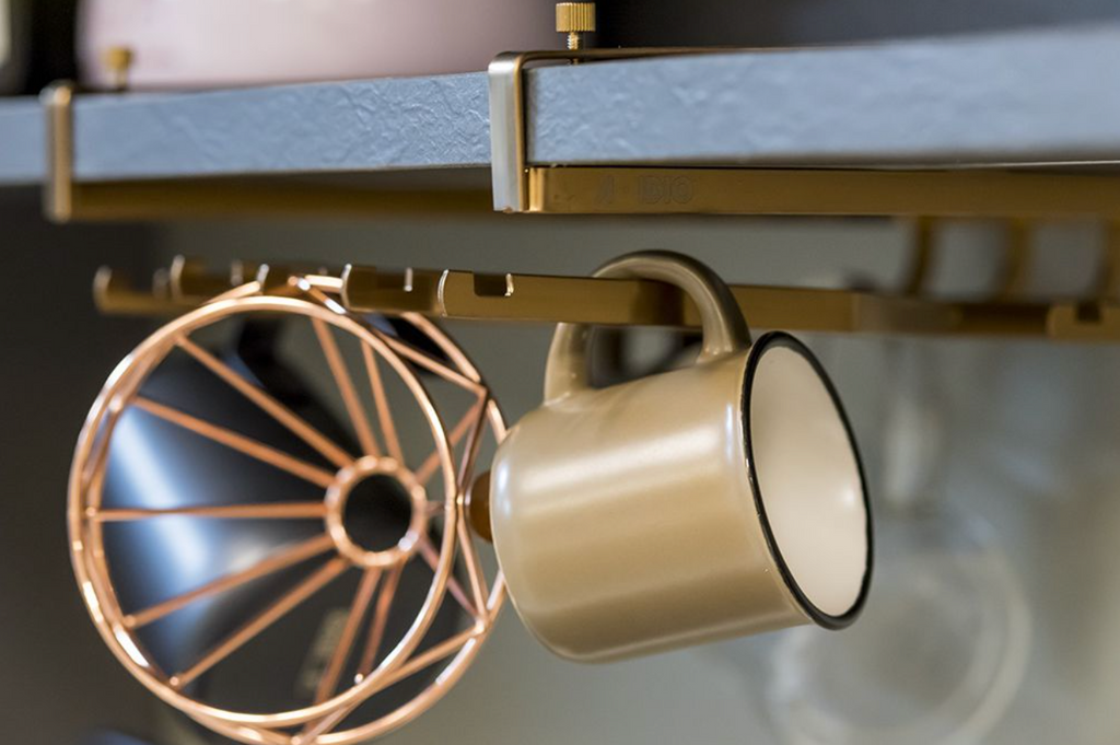 吊杯的下方鐵架呈現出獨特的幾何直線圖形,結合了現代感和簡約風格。精巧的造型特別適合放置高腳杯、咖啡杯、茶杯和馬克杯等不同類型的杯具。