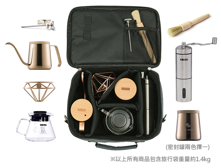 1.人文時尚手沖細口壺鈦金版 350ml 附蓋 2.精工手搖磨豆機 3.鑽石咖啡濾杯鈦金版 4.鈦金密封罐350ml (兩色擇一) 5.耐熱玻璃壺360ml 6.行動咖啡旅行袋 7.咖啡專用溫度計 8.清潔毛刷 9.期間加贈-V60錐形濾紙x1包(內含100入) ※以上所有商品包含旅行袋重量約1.4kg