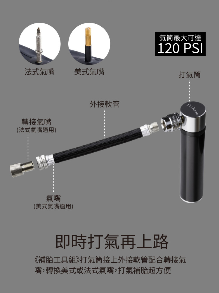本體重量:385 g 本體尺寸:W175 x H125 x D55 mm 材質:尼龍, 矽膠, 鋁合金 包裝尺寸:W90 x H185 x D55 mm 含包裝重量:435 g 包裝內容物: 打氣筒、轉接氣嘴(美式、法式轉換)、外接軟管、補胎片、銼胎片、挖胎棒、扳手2、3、4、5、6、8 mm。