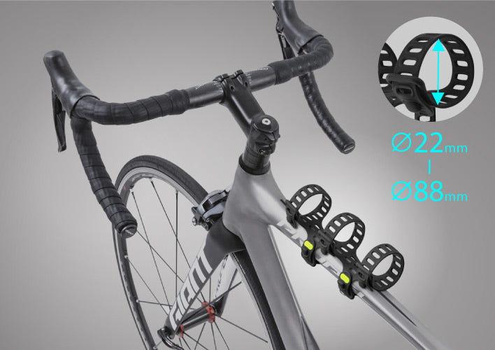 -一體成型彈力綁帶,快速拆裝於車管上 -可正反雙面使用,適用車管直徑22~88mm -多綁帶結構,可綁附於單車相鄰的車架使用,因應不同的物品使用 -適用Bone自行車充電組(可選購) -適用Bone運動口袋套攜帶卡片、鈔票(可選購) -環保矽膠材質,耐磨耐髒可水洗