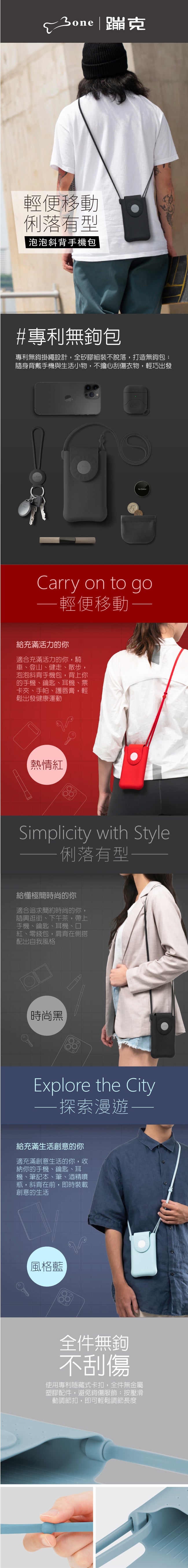 -一體成形的行動手機包,時尚有型 -專利無鉤掛繩設計、保持輕柔的接觸、避免鉤傷服飾 -隱藏式磁力扣開關 -雙隔層,區隔證件、鈔票、鑰匙隨身物品、避免刮傷手機 -泡泡邊角防撞設計,保護手機 -環保全矽膠材質,耐髒、可水洗 -專利隱藏式卡扣背帶,可調節使用長度