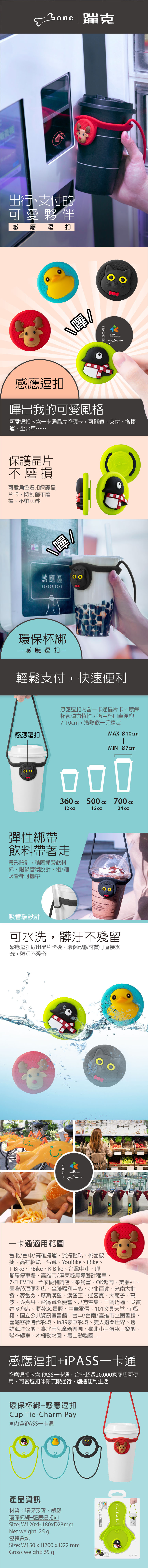 - 角色感應逗扣內含一卡通感應卡,可儲值、支付、搭車… - 可愛角色逗扣保護晶片卡,防止磨損、不怕雨淋 - 環保矽膠材質耐污,可水洗 - 彈性矽膠綁帶,兼容市售 350ml 到 750ml 飲料杯 - 吸管環設計,粗/細吸管都可牢牢套住 - 簡約輕巧隨身帶,使用好方便