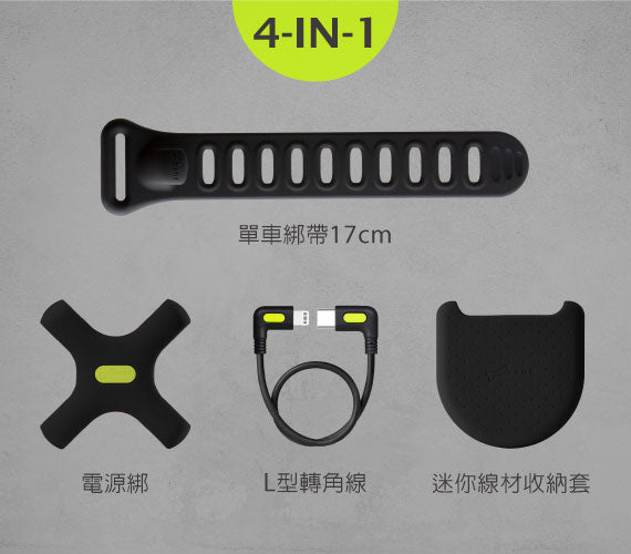 - 包含L型轉角充電線 + 迷你線材收納套 + 單車綁帶 + 行動電源綁 - 通用綁帶結構,可快速固定在自行車龍頭或手把 - 可與Tie Connect 單車手機綁套組搭配使用 - 行動電源X型綁可與 Bike Tie 及 Bike Tie Pro 結合使用 - 雙向L型轉角設計,線材順著設備避免凸出 - Apple MFi 原廠晶片認證 - 高速線路設計,支援 PD 快速充電 - 環保TPE線材~25cm - 迷你線材收納套,保護線材、輕薄好收納