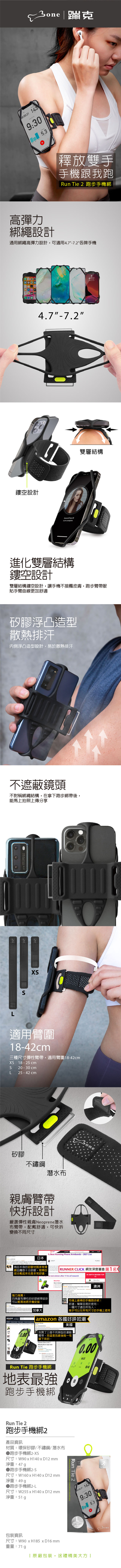 - Run Tie 第一代在全球電商平台Amazon受到各國好評,佳評如潮 - 矽膠內側浮凸造型,易於散熱排汗 - 高彈力綁繩,可適用 4.7 到 7.2 吋各牌手機(新款iPhone 13系列適用) - 雙層結構,手機不接觸皮膚、綁帶更服貼手臂曲線 - 不影響手機的功能使用,如 : Touch ID 、Face ID - 不遮蔽鏡頭,不對稱綁繩結構,拿下跑步綁帶後,能馬上拍照上傳分享 - 彈性臂帶,可單獨拆下直接水洗、替換,避免汗水累積在產品上而滋生細菌 - 嚴選親膚的 Neoprene 材質(潛水衣布料材質),輕巧柔軟有彈性 *跑步綁臂帶有多種尺寸,適用臂圍如尺寸表標示* 三種尺寸彈性臂帶,適用臂圍18-42cm XS:18 - 25 cm S:20 - 30 cm L:25 - 42 cm
