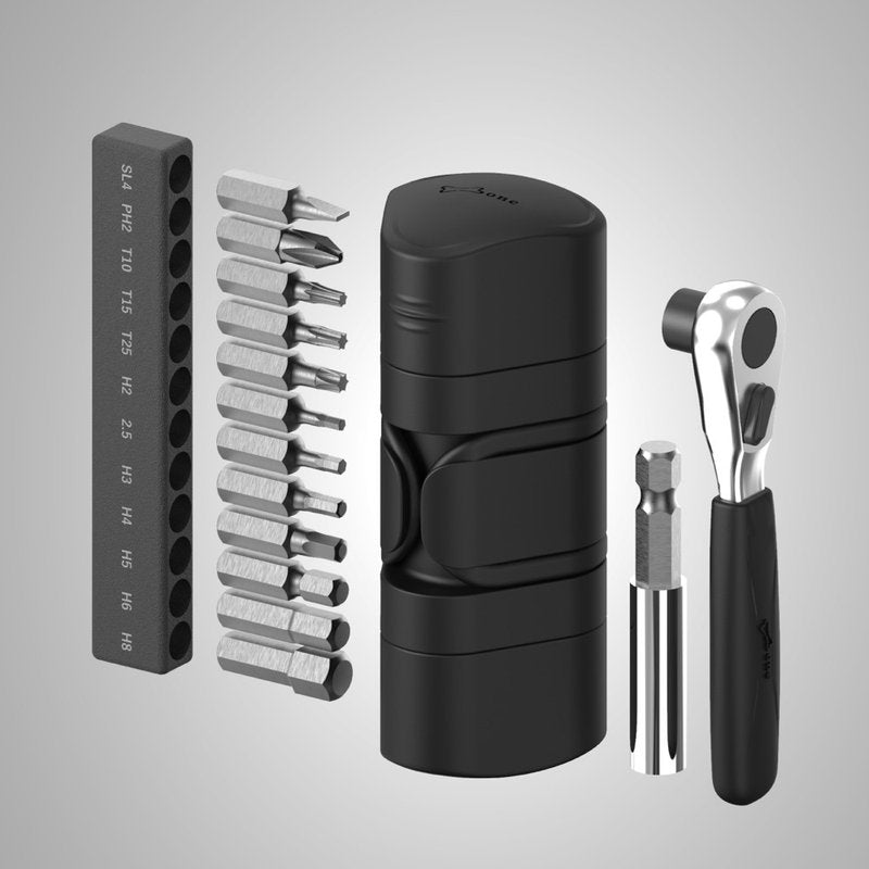 包裝內容物 自行車隨行工具組-Lite-矽料、棘輪板手、棘輪套頭組、迷你棘輪扳手72齒、延長桿、S2套頭12件組、 一字型:SL4、 十字型:PH2、 梅花型:T10、T15、T25、 六角型:H2、H2.5、H3、H4、H5、H6、H8 (含TPR環保套頭套)。