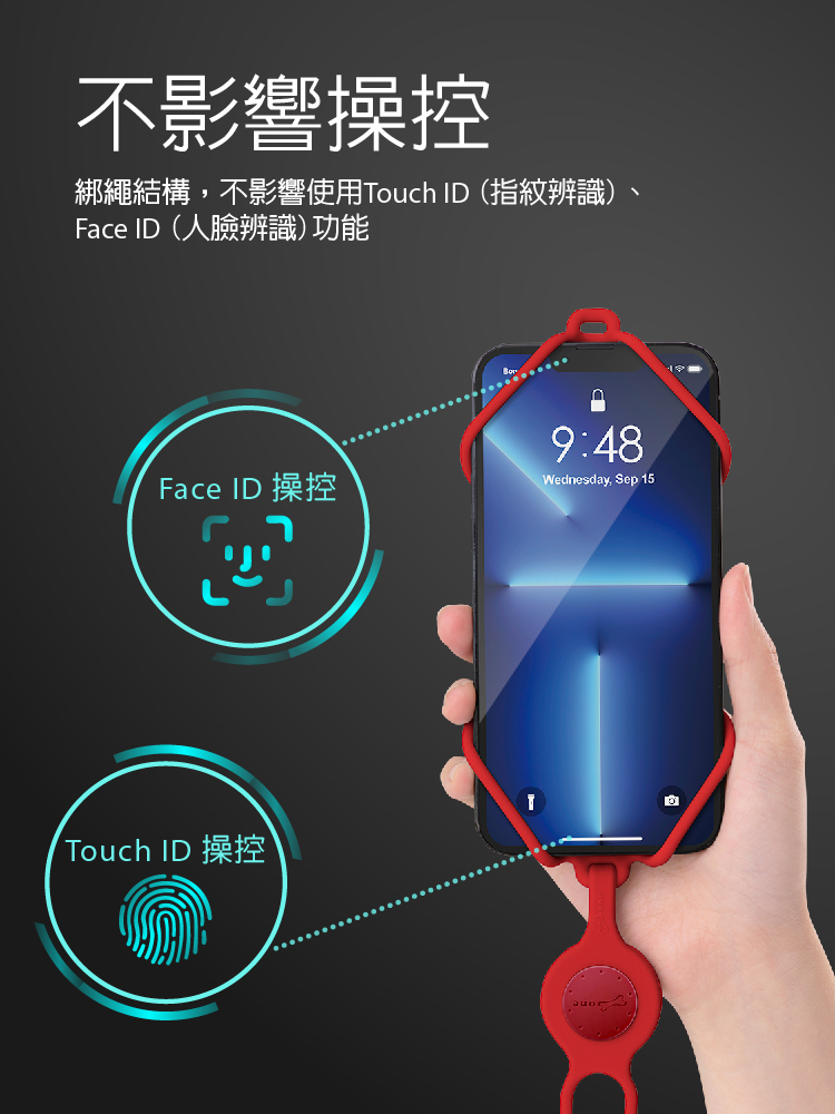 -原創綁帶設計,適用4.7~7.2吋的手機 -適用更大"中間、側邊"鏡頭手機 -掛繩隱藏式綁扣設計,快速拆裝 -調節扣設計,調節掛繩長度 -環保矽膠材質耐污耐磨,可水洗