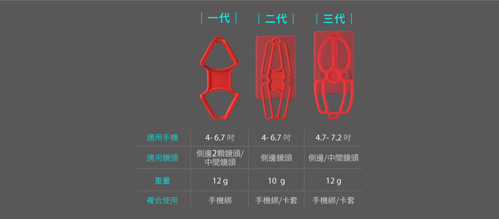 *原創綁帶設計,適用4.7~7.2吋的手機 *適用更大"中間、側邊"鏡頭手機 *掛繩隱藏式綁扣設計,快速拆裝 *調節扣設計,調節掛繩(頸掛、側背)長度 *可拆式卡片套,可搭配手機綁或拆下單獨使用 *環保矽膠材質耐污耐磨,可水洗